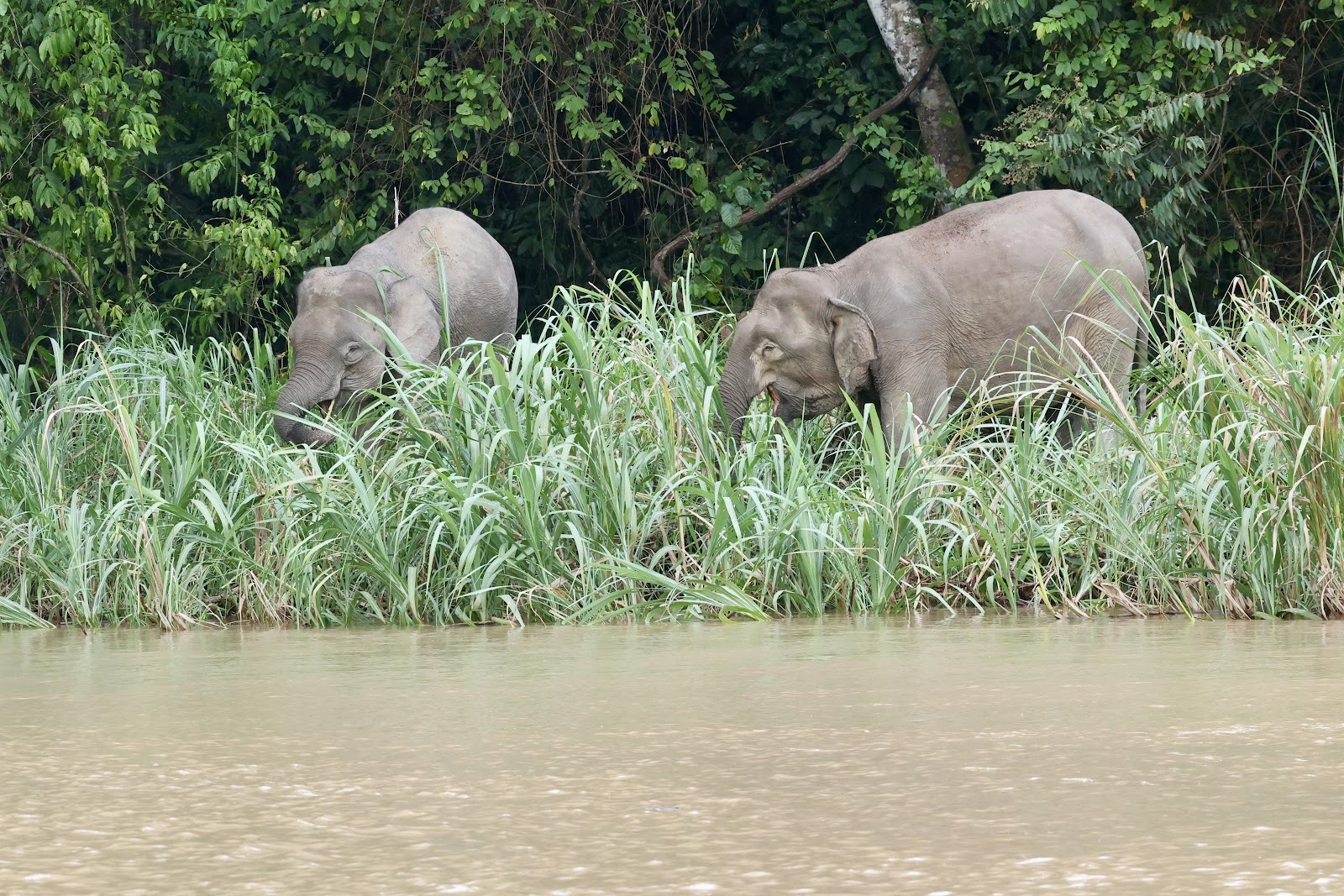 On our first afternoon, we were supposed to go out on a boat looking for birds. They told us s ome Pygmy elephants had been spotted up the river and asked if we wanted to se them. Without hesitation, we agreed and they brought out a larger faster boat. We speed down the river and spotted them about 20 feet deep into the forest. Eventually, they came out to the grass at the river bank. Chris even spotted a baby that was just a little taller than the grasss